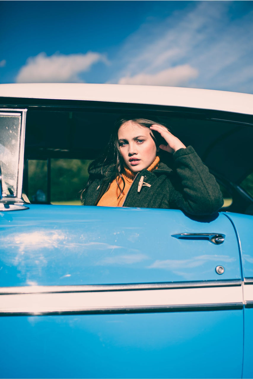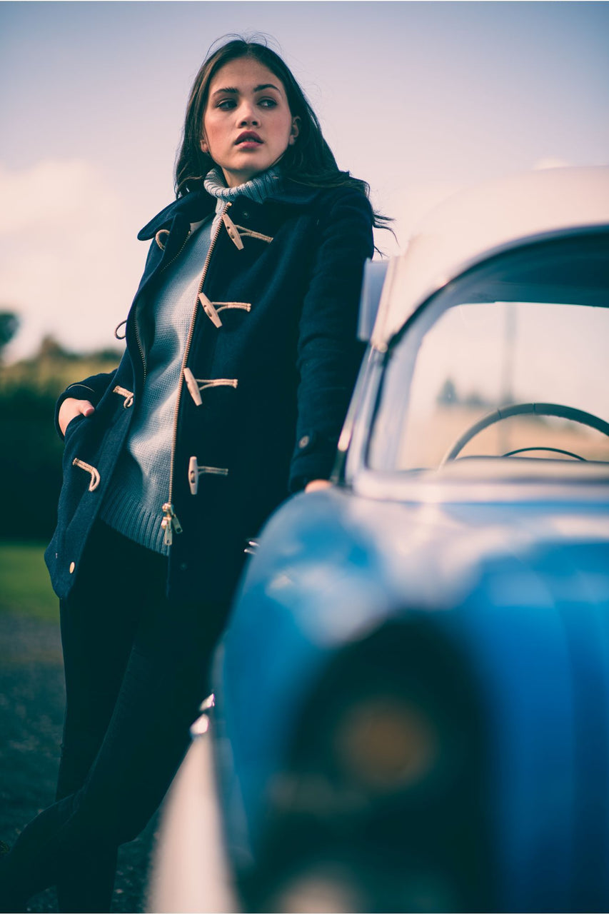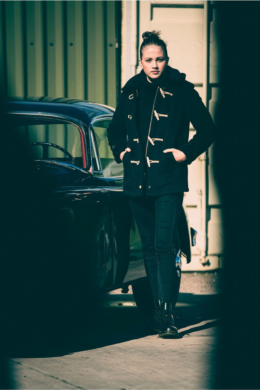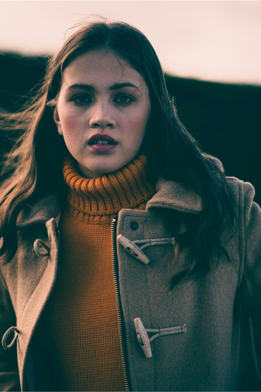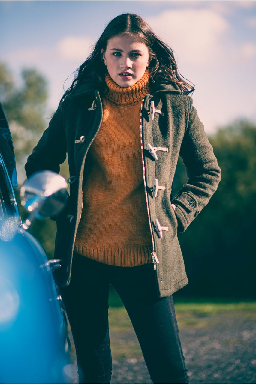 Spike, men's and women's, is a hybrid duffle/car coat with removable hood, adjusted around the face by brass studs, stand up collar and a substantial two-way brass zip for greater body freedom. Based on a fit like the London, but shorter, and fitted with a heavy brass zip.
